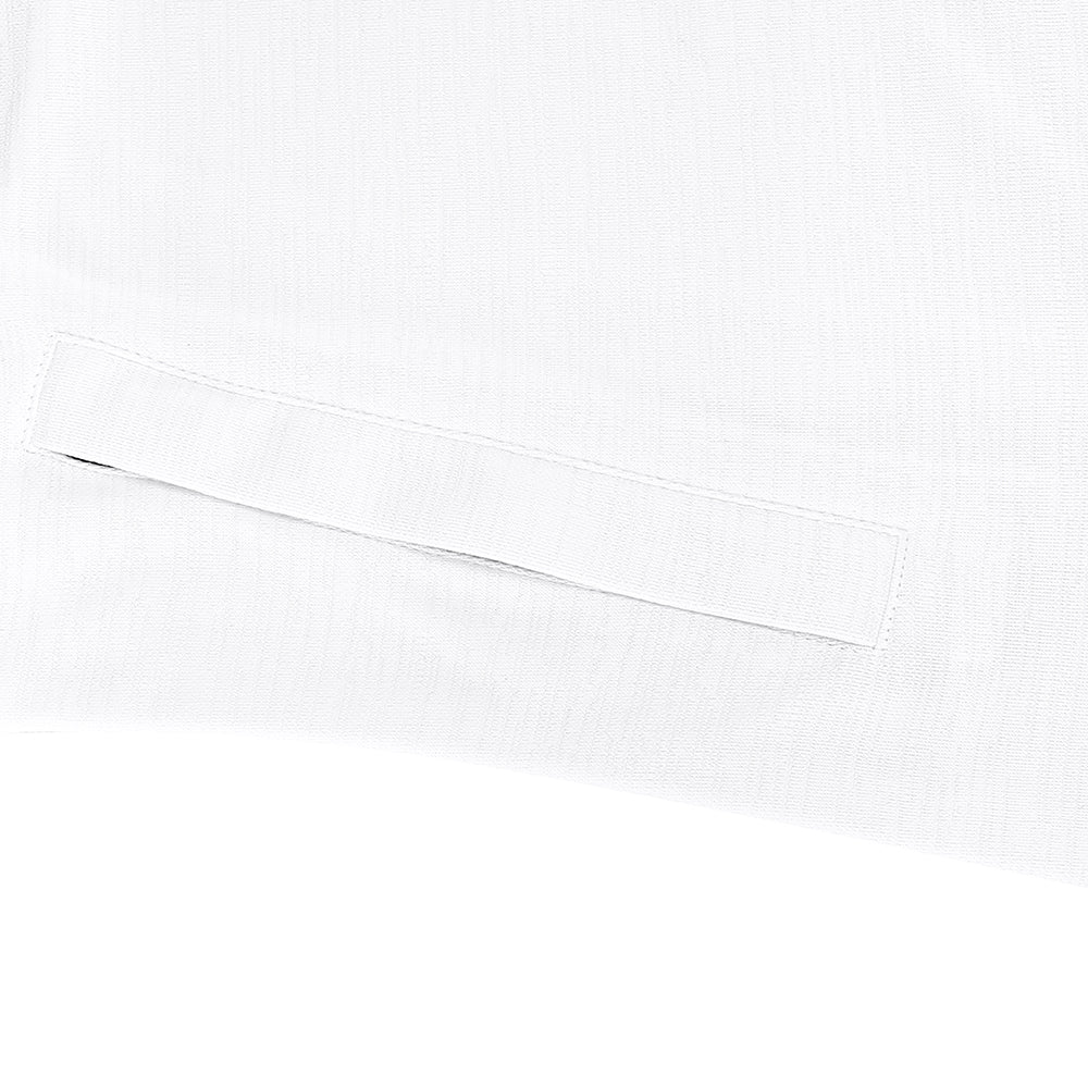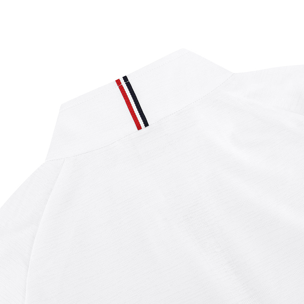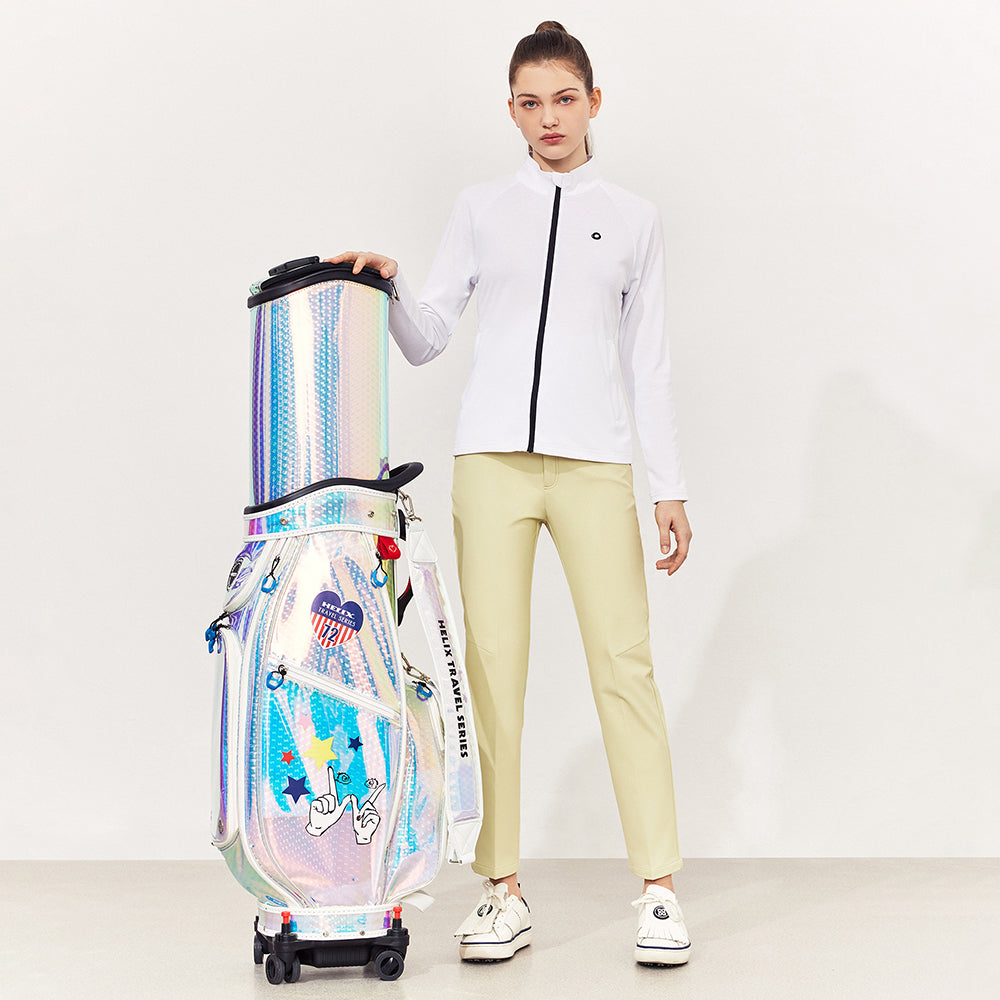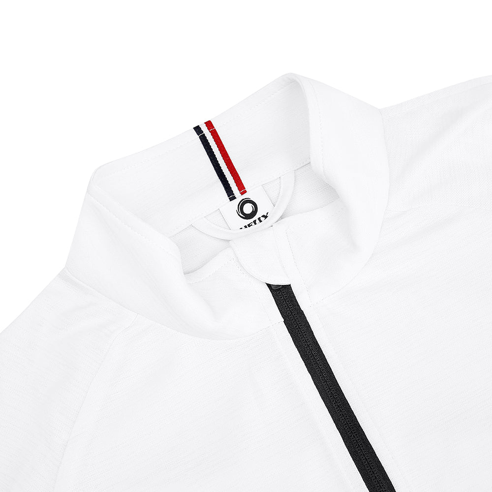 This jacket is made of a soft, cotton-like jacquard fabric that is lightweight and breathable. It features a stand collar and full zip for easy wear, along with two zippered side pockets for secure storage. The chest logo and tricolor ribbon on the back collar add simple embellishments. The design is clean and fashionable, making it suitable for outdoor activities and everyday wear.