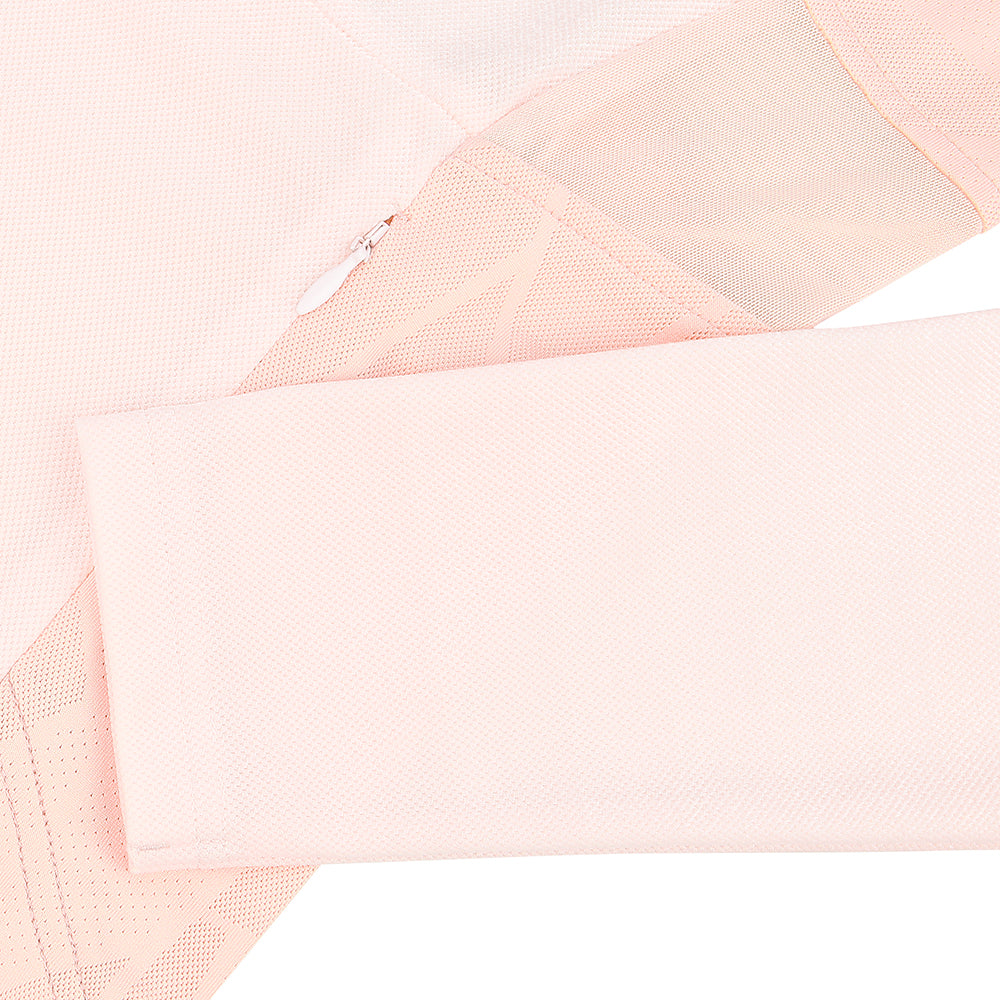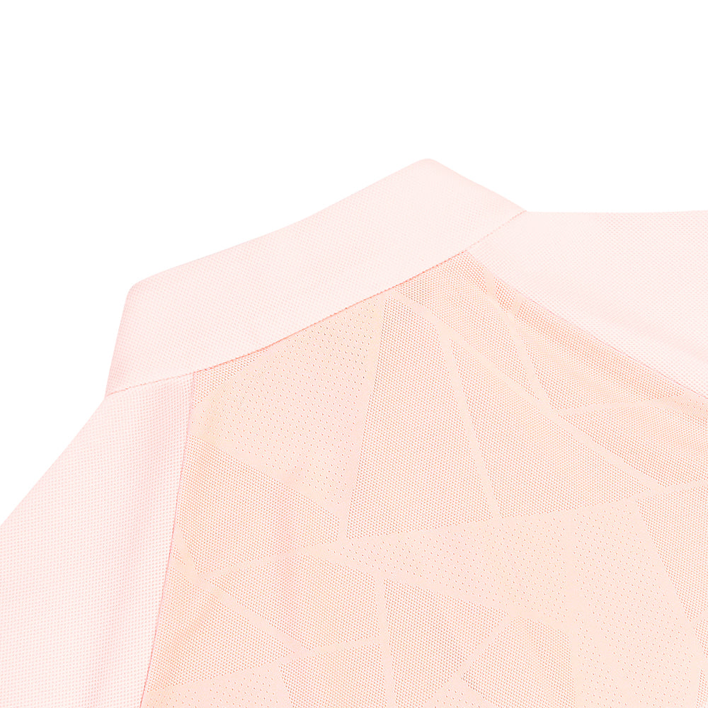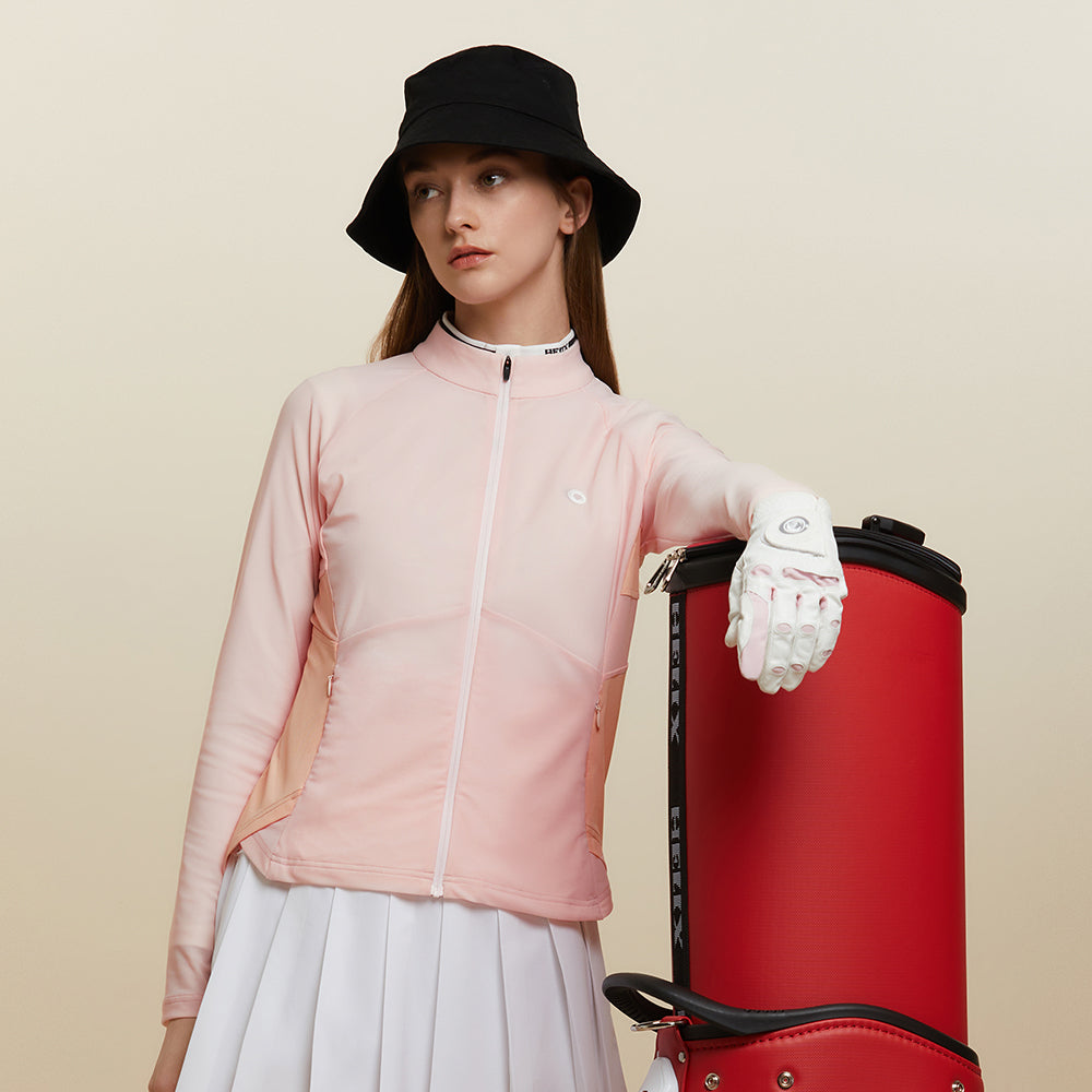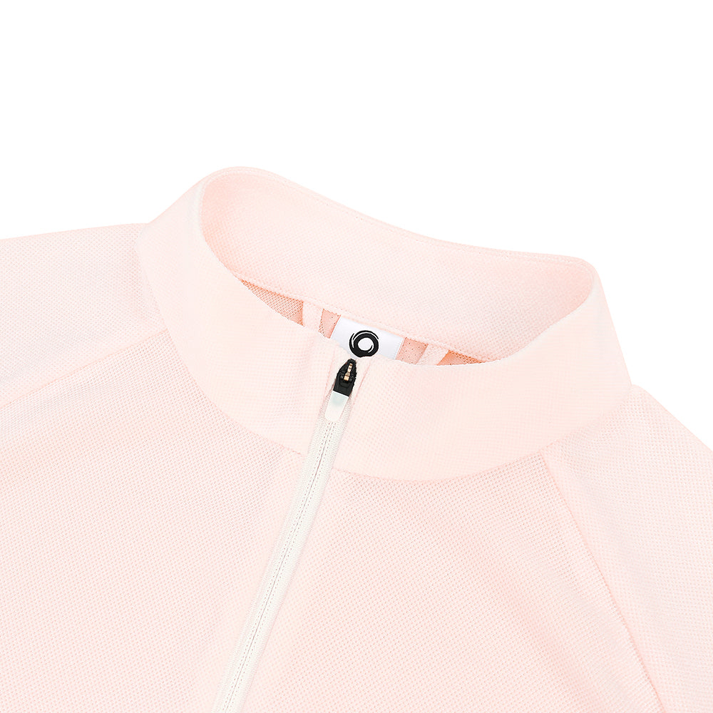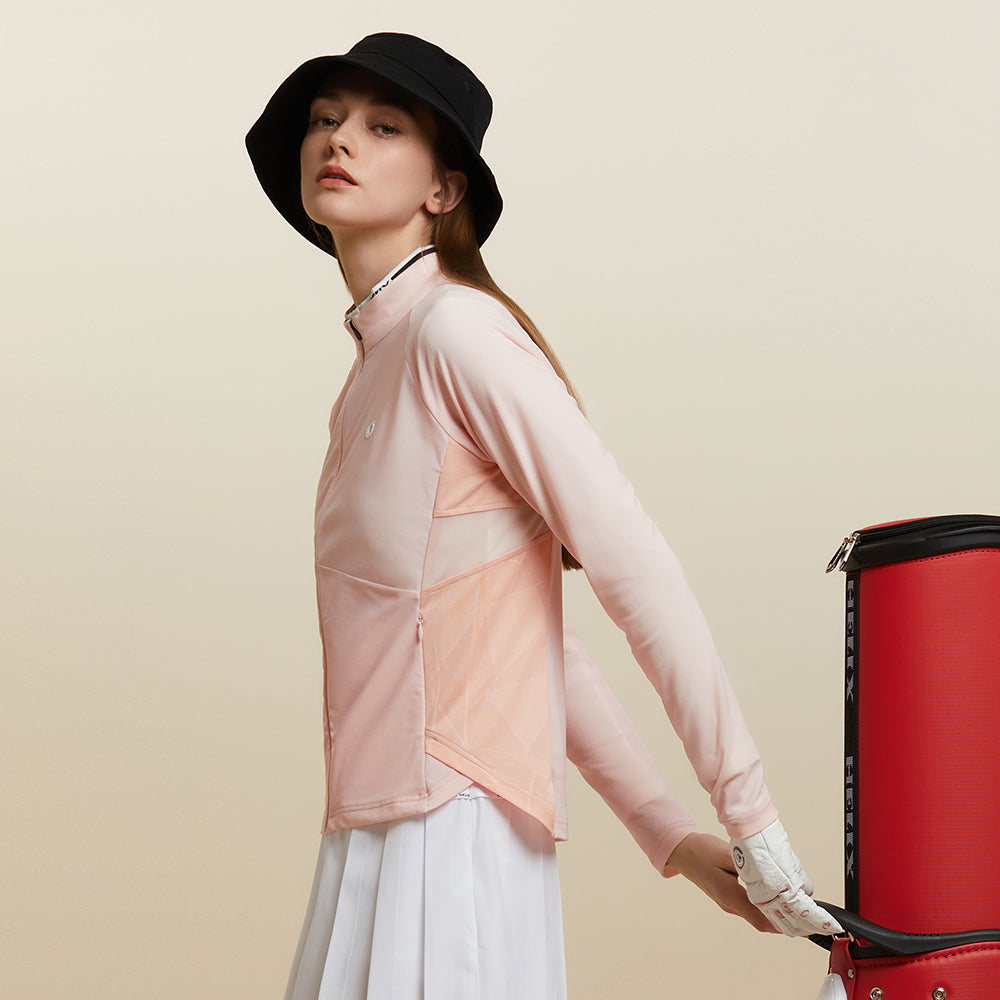 This jacket features a lightweight, soft piqué fabric with mesh panels sewn into the sides and back for enhanced breathability and comfort. It is adorned with a delicate and attractive embroidered logo, and features two zippered side pockets for safe storage. The jacket's elegant and stylish design makes it suitable for outdoor activities as well as everyday wear.