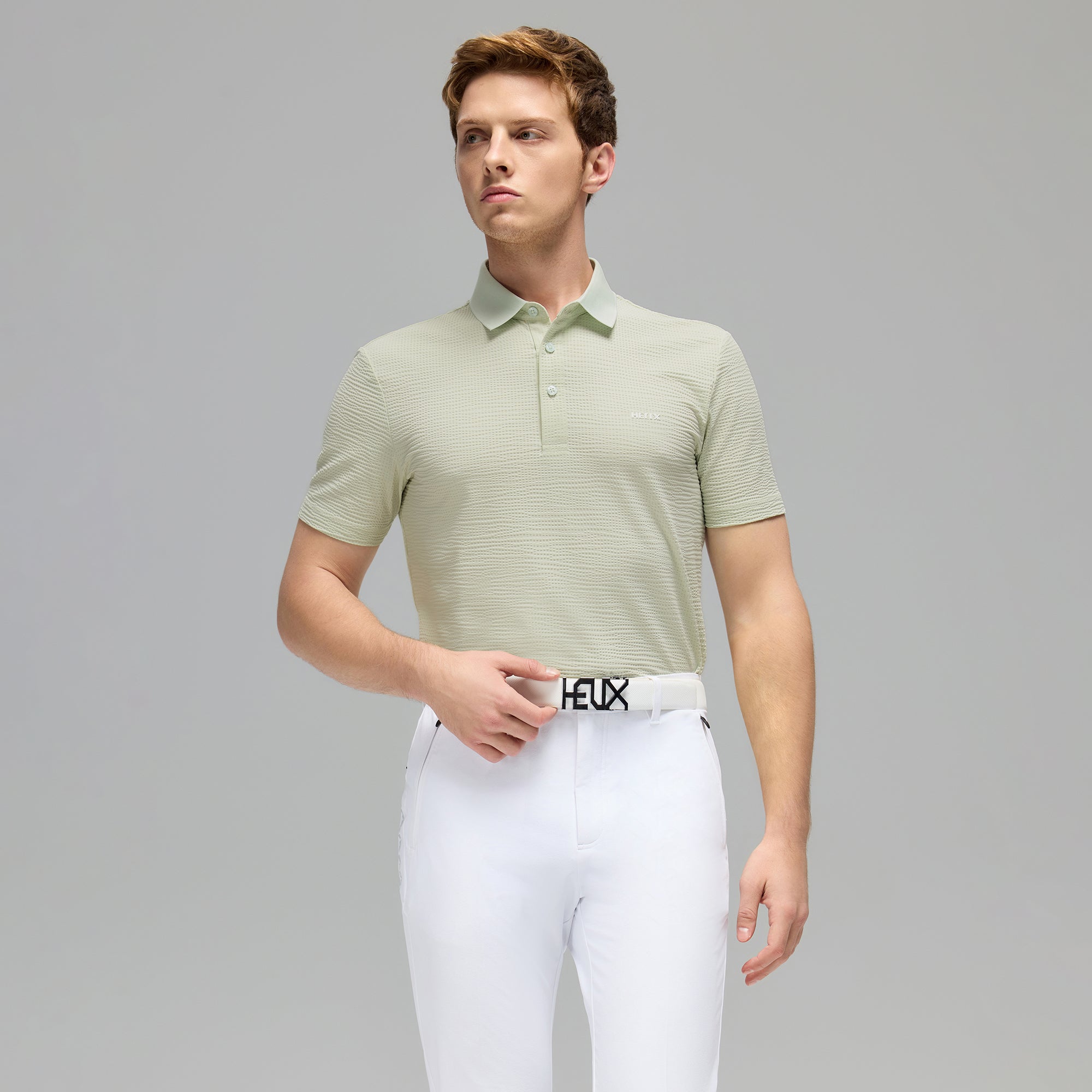 This short-sleeve polo shirt embodies summer elegance with its fresh tone, exuding a sense of ease and sophistication.