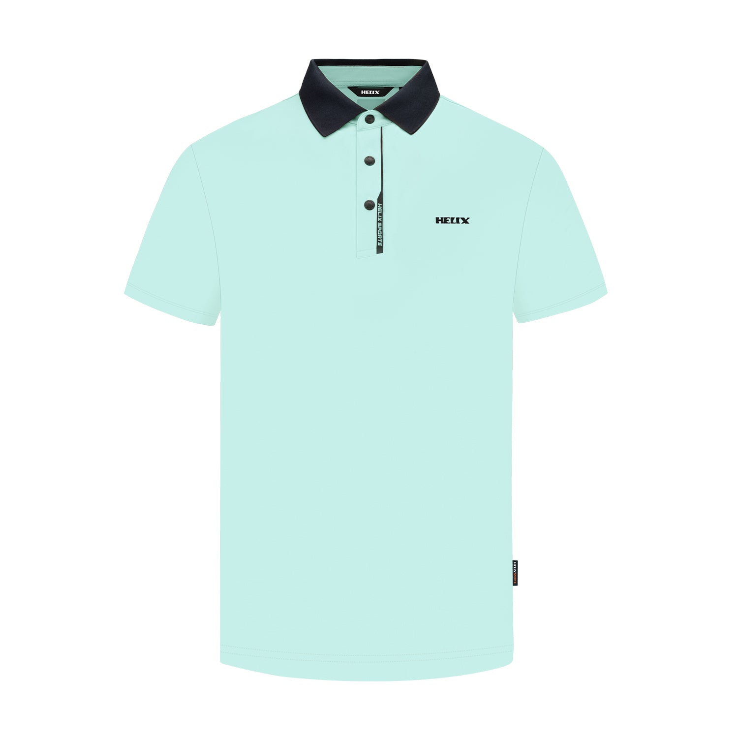 This polo shirt features a classic turn-down collar with an asymmetrical diagonal placket and three matching buttons. The brand logo adorns the left chest, creating a simple and clean look suitable for both sports and everyday wear.
